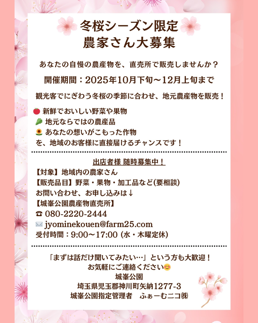 観光協会会員のふぁーむニコ㈱さんからのお知らせです。2025年10月下旬から12月上旬まで、城峯公園農産物直売所で、農産物等を販売したい農家さんを募集しています!詳しくは別添のチラシをご覧ください。興味のある方は、城峯公園農産…