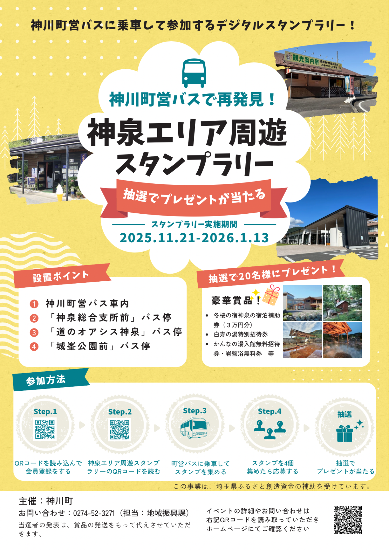 神川町営バスに乗車して、神泉エリアをめぐるデジタルスタンプラリーが開催されます!期間は、令和7年11月21日から令和8年1月13日まででです。町営バスに乗りながら、神泉エリアの魅力を再発見いただければと思います。11月は冬桜と紅葉…