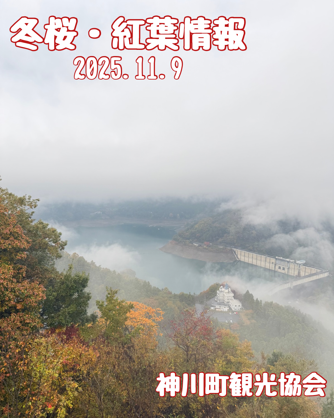 11月9日の冬桜・紅葉情報についてお知らせします。9日はあいにくの天気でしたが、城峯公園展望台から望む神流湖、下久保ダムが幻想的でした。動画は神川町観光協会のInstagramにアップしておりますので、気になる方はぜひご覧ください…