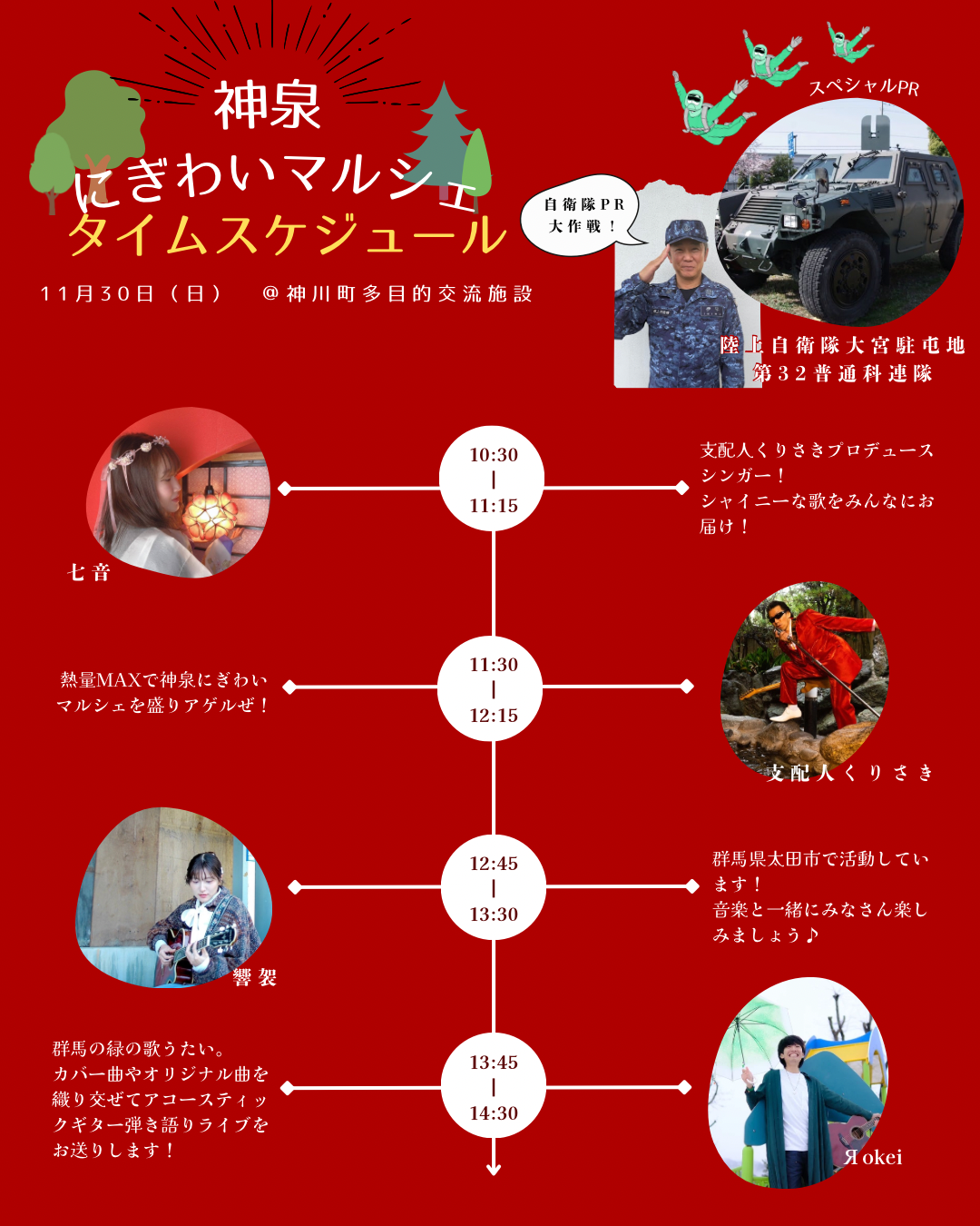 11月30日(日)に開催する「神泉にぎわいマルシェ」のタイムスケジュールは画像のとおりとなります!歌謡曲や弾き語り等、音楽をお楽しみいただけます!また、陸上自衛隊大宮駐屯地第32普通か連隊がPRにいらっしゃいます!高機動車…