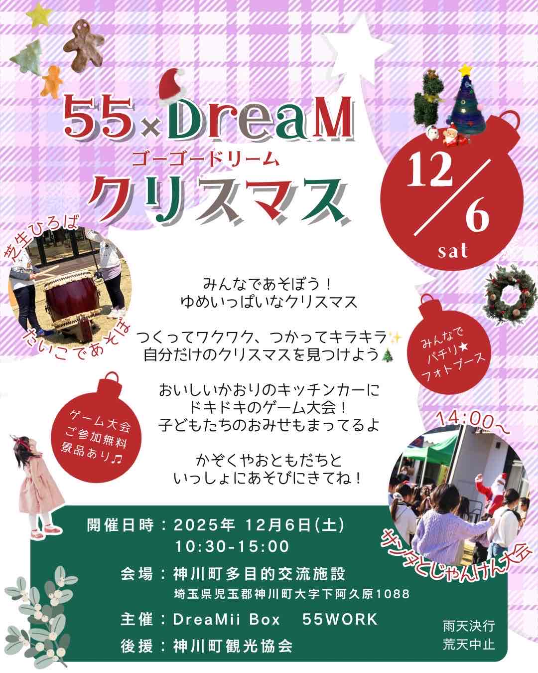 12月6日(土)に神川町多目的交流施設で「55×DreaMクリスマス」(イベント)が開催されます!観光協会会員55×DreaMさんは、お子さんや家族が参加できるイベントを多数主催しており、昨年続き、クリスマスイベントを開催します!お子…