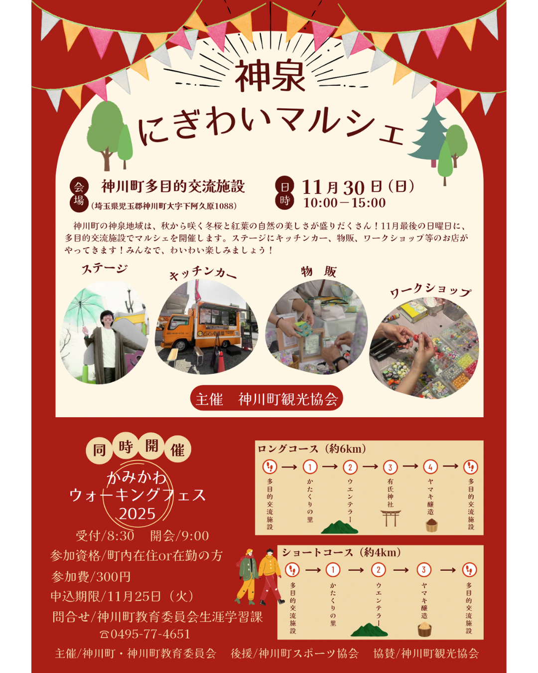 11月30日(日)に神川町多目的交流施設で「神泉にぎわいマルシェ」を開始します!ステージ、キッチンカー、物販、ワークショップ等、チラシに掲載が間に合わなかった出店もございます!(神泉地区のお野菜が販売される予定…!)冬桜…